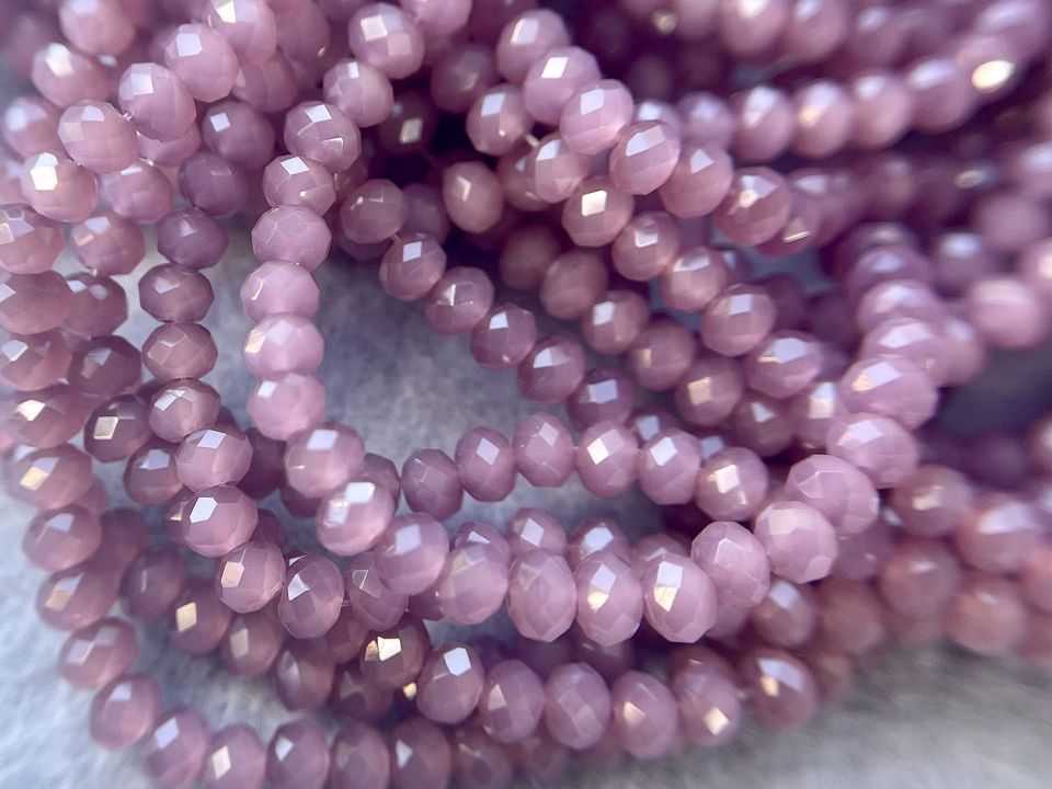 Кришталеві намистини, грановані. Розмір: 3*3,5мм, отвір: 1 мм. Форма: рондель, сфера. У нитці: 145+-5шт. Ціна за 1 нитку. Колір-фрезовий напівпрозорий.