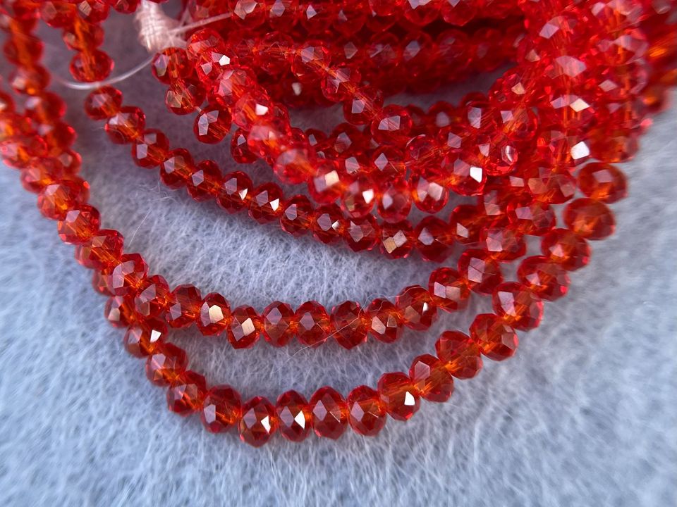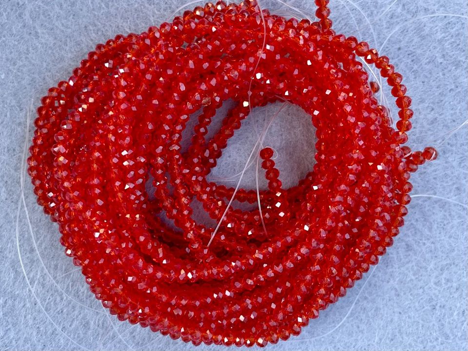 Кришталеві намистини, грановані. Розмір: 2*3мм, отвір: 1 мм. Форма: рондель, сфера. У нитці: 160+-3шт. Ціна за 1 нитку. Колір червоний.