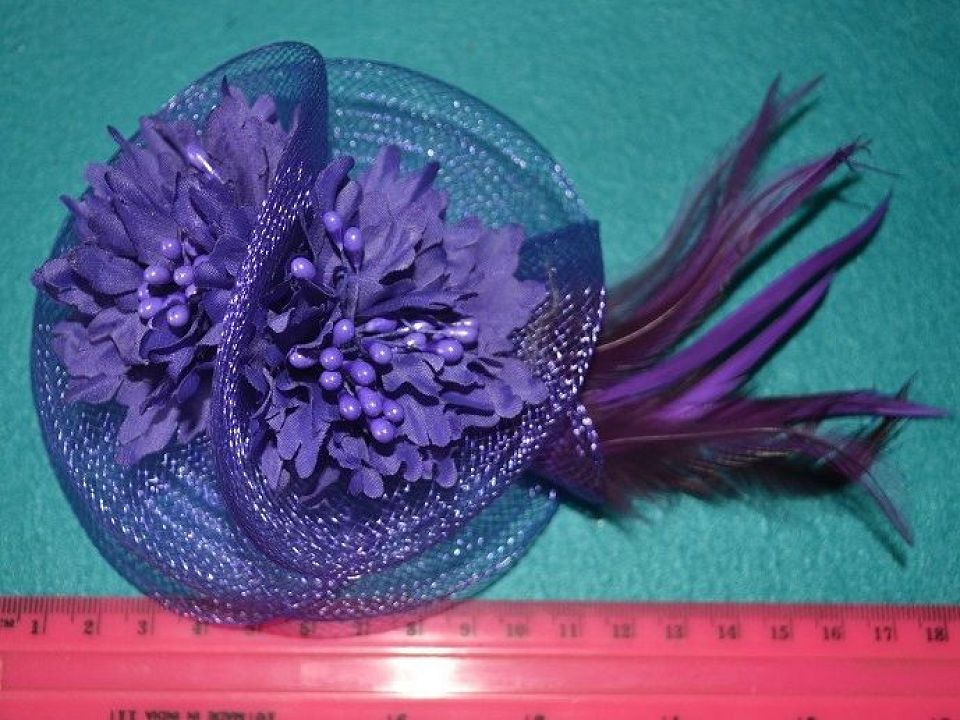 Квітка 2 в 1, з тканини-прикрашений тичинками, пір'ям і регіліном. Діаметр ~ 10-15см. Може використовуватися як шпилька або як брошку. Ціна за 1 шт