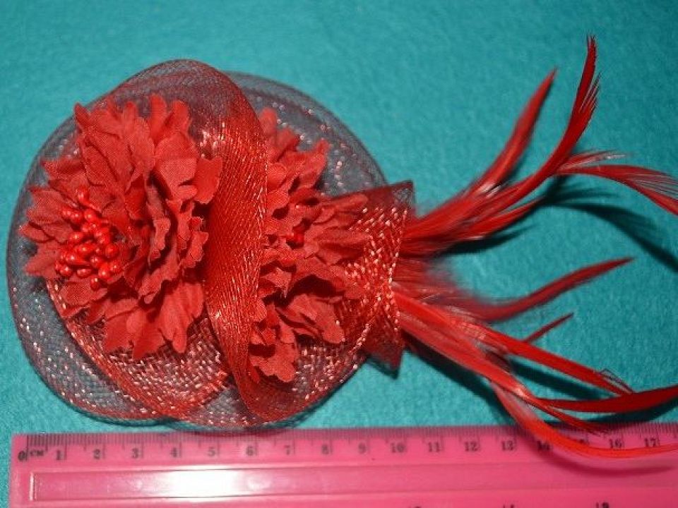 Квітка 2 в 1, з тканини-прикрашений тичинками, пір'ям і регіліном. Діаметр ~ 10-15см. Може використовуватися як шпилька або як брошку. Ціна за 1 шт
