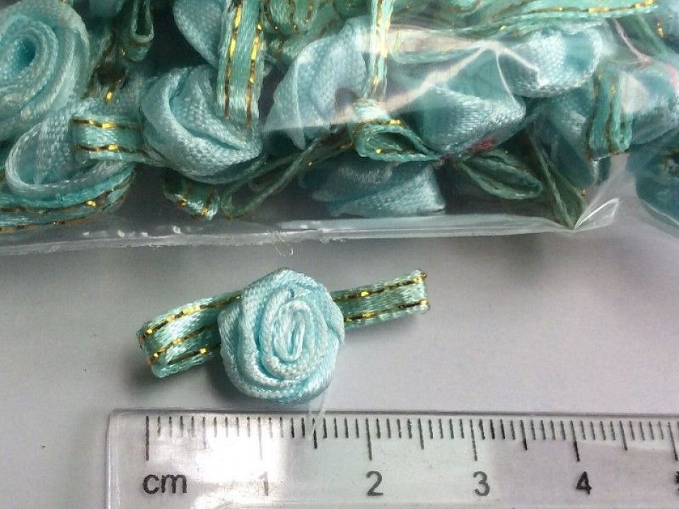 Атласна трояндочка з листочками Розмір: трояндочка - 15 мм, з листочками - 25 мм Колір: м'ятний Упаковка 50 шт