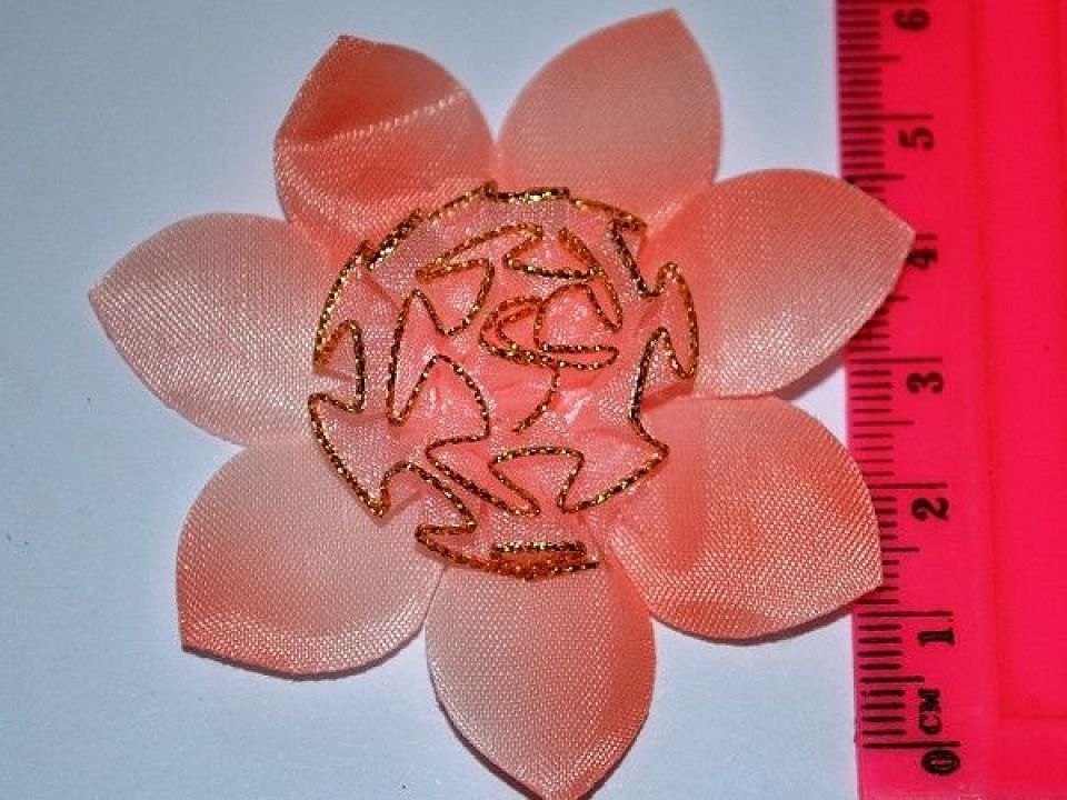 Квітка з органзи з пелюстками використовуються для декорування будь-якої вашої роботи. Діаметр квітки 45мм, висота 12-15мм колір кораловий упаковка 10шт.