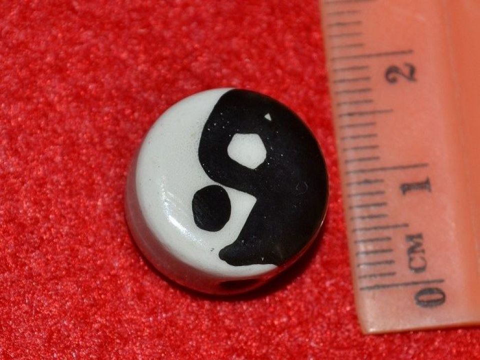 Фарфорова намистинка-плоска, ручної роботи з традиційної китайської розписом по глазурі. Розмір 18мм, діаметр отвору: близько 2 мм. Біла глазур з чорно-білим символом інь і ян.