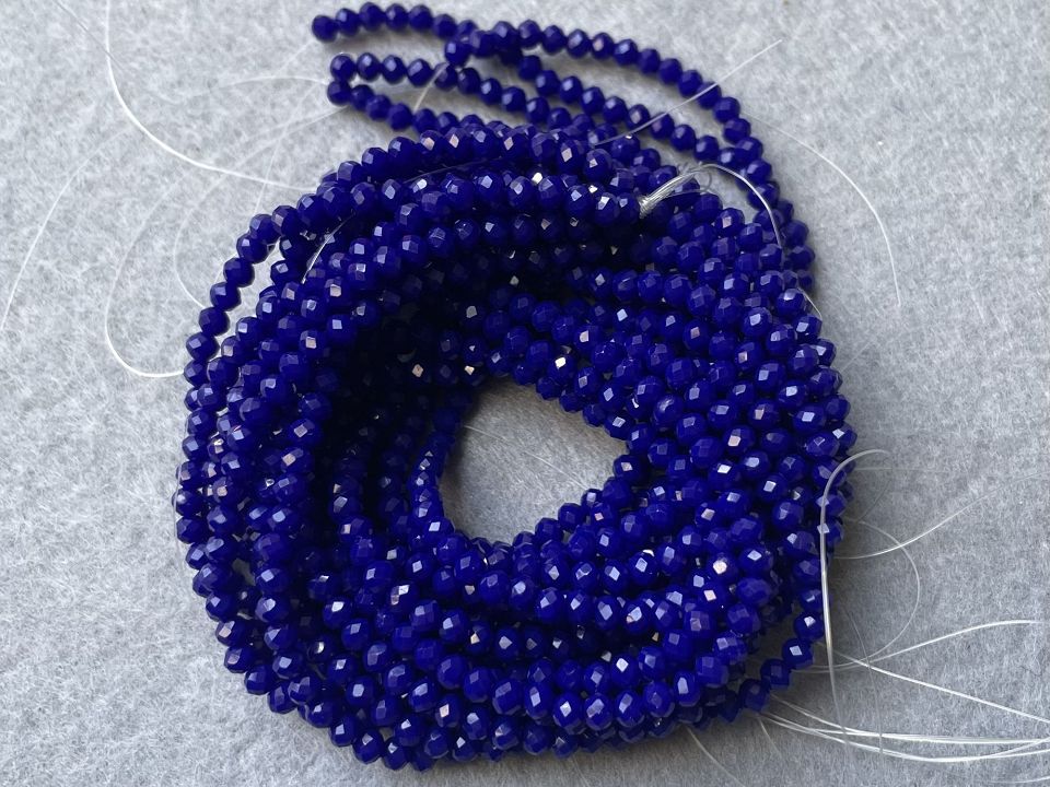 Кришталеві намистини, грановані. Розмір: 3*3,5мм, отвір: 1 мм. Форма: рондель, сфера. У нитці: 120+-5шт. Ціна за 1 нитку. Колір-електрик.