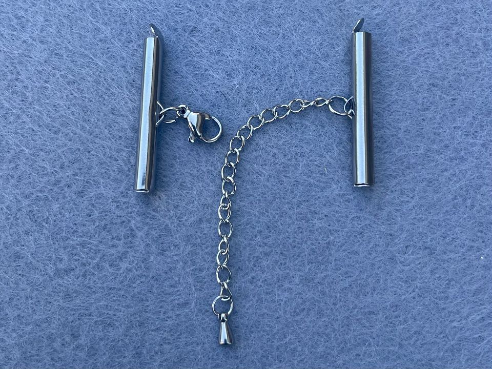Застібка із затискачем для біжутерії та подовженням з нержавіючої сталі. У набір входить: затискач: 3см * 0,4см; карабін: 1см; сполучні кільця: 5мм*2шт; подовження - 5см.