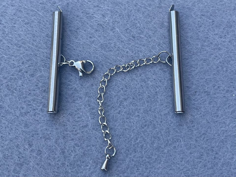 Застібка із затискачем для біжутерії та подовженням з нержавіючої сталі. У набір входить: затискач: 4см * 0,4см; карабін: 1см; сполучні кільця: 5мм*2шт; подовження - 5см.