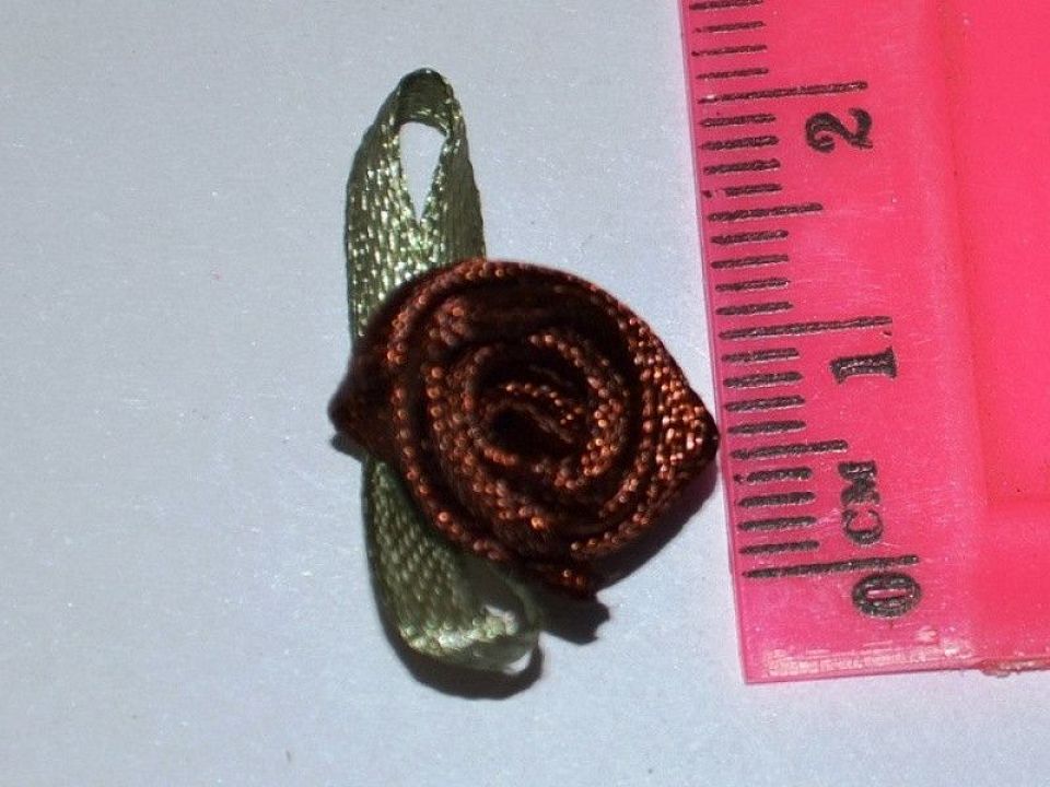 Атласна трояндочка з листочками Розмір: трояндочка - 15 мм, з листочками - 25 мм Колір коричневий Упаковка 50 шт