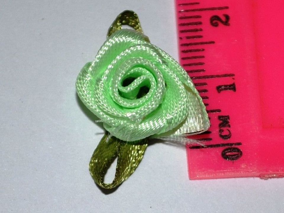 Атласна трояндочка з листочками Розмір: трояндочка - 15 мм, з листочками - 25 мм Колір: салатовий Упаковка 50 шт