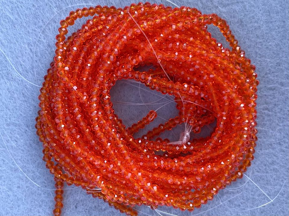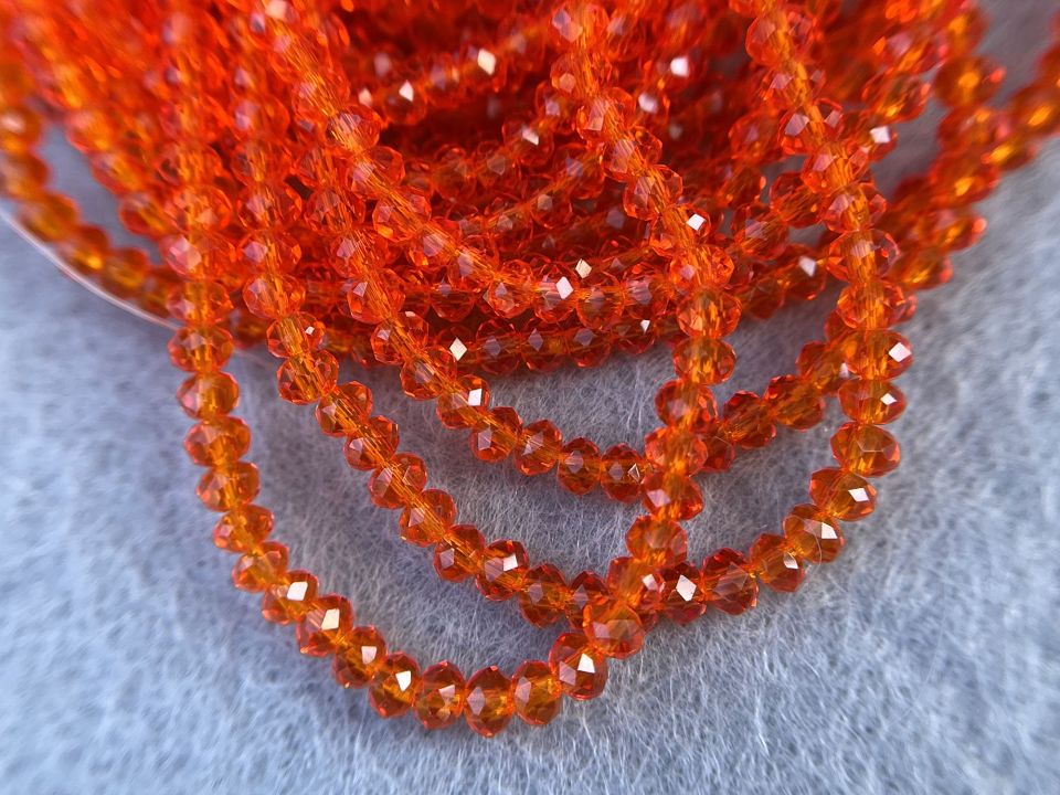 Кришталеві намистини, грановані. Розмір: 2*3мм, отвір: 1 мм. Форма: рондель, сфера. У нитці: 160+-3шт. Ціна за 1 нитку. Колір помаранчевий.