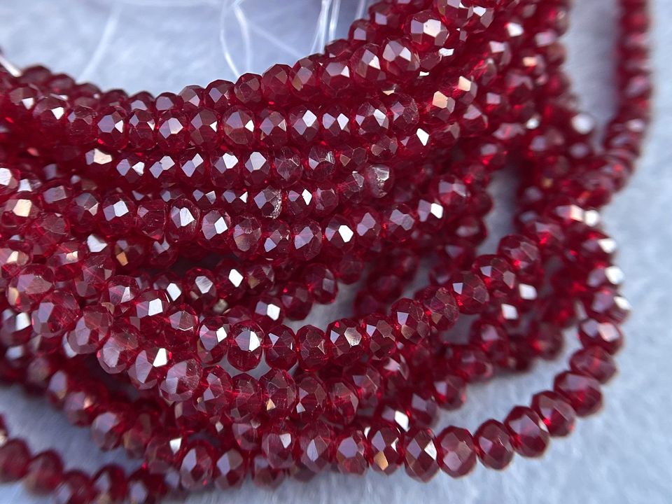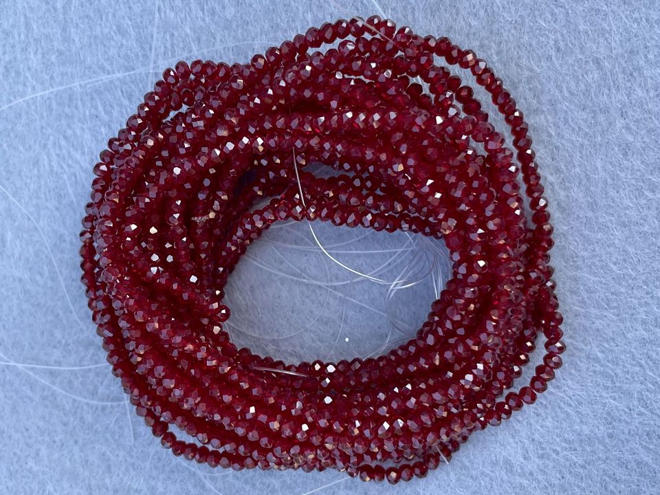 Кришталеві намистини, грановані. Розмір: 2*3мм, отвір: 1 мм. Форма: рондель, сфера. У нитці: 160+-3шт. Ціна за 1 нитку. Колір-бордо.