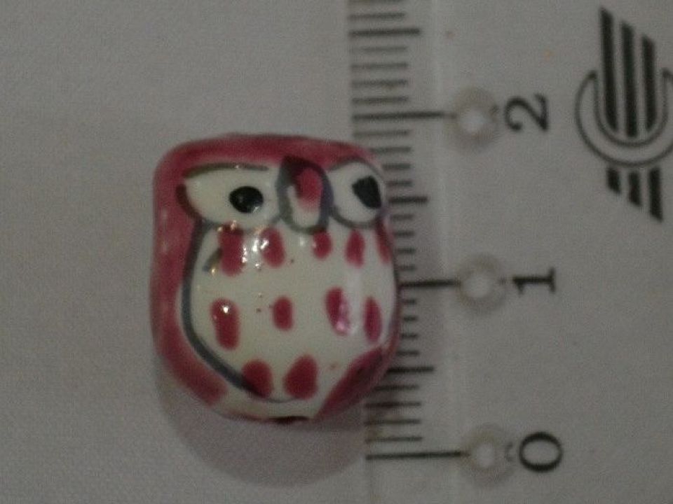 Фарфорова намистинка ручної роботи у вигляді сови з розписом по глазурі. Діаметр отвору: близько 2 мм. Ціна за 1 намистину.