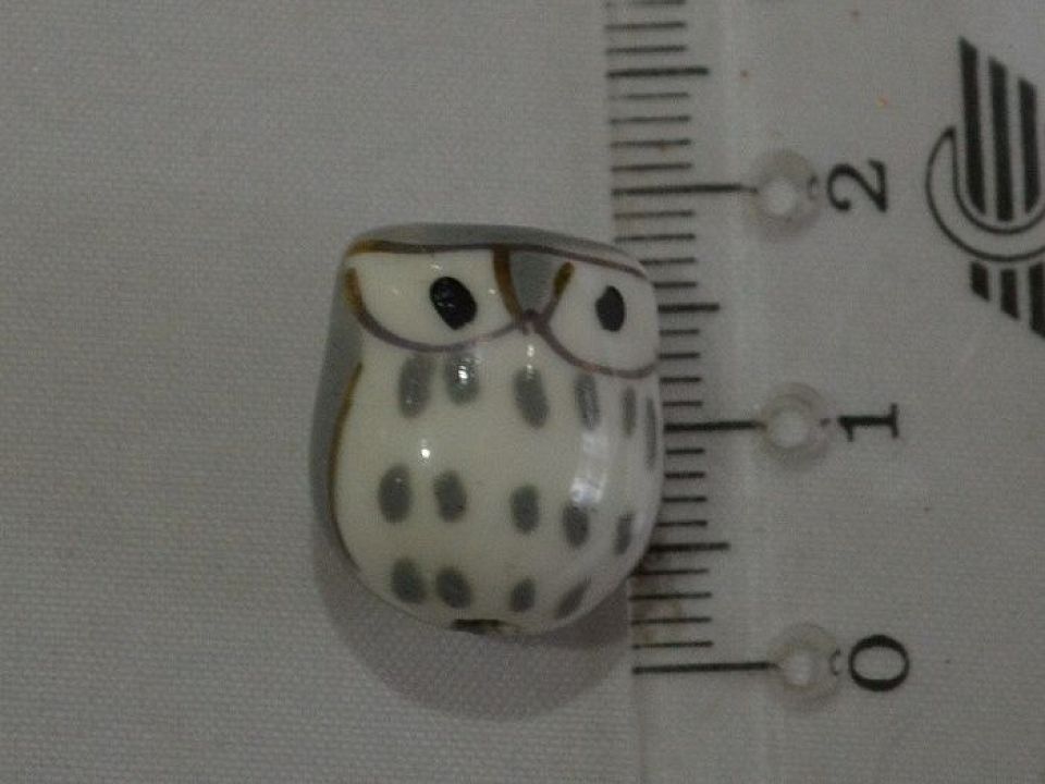 Фарфорова намистинка ручної роботи у вигляді сови з розписом по глазурі. Діаметр отвору: близько 2 мм. Ціна за 1 намистину.