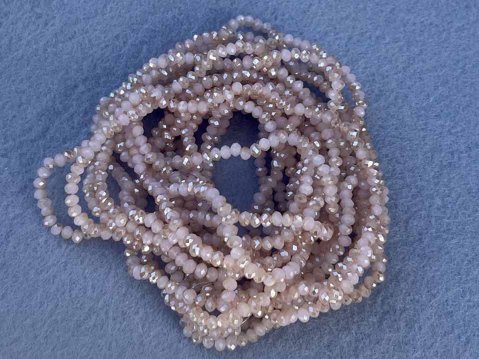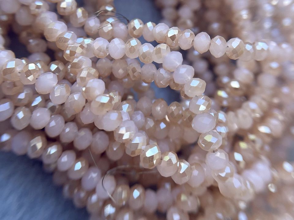 Кришталеві намистини, грановані. Розмір: 3*3,5мм, отвір: 1 мм. Форма: рондель, сфера. У нитці: 145+-5шт. Ціна за 1 нитку. Колір персиково-бежевий.