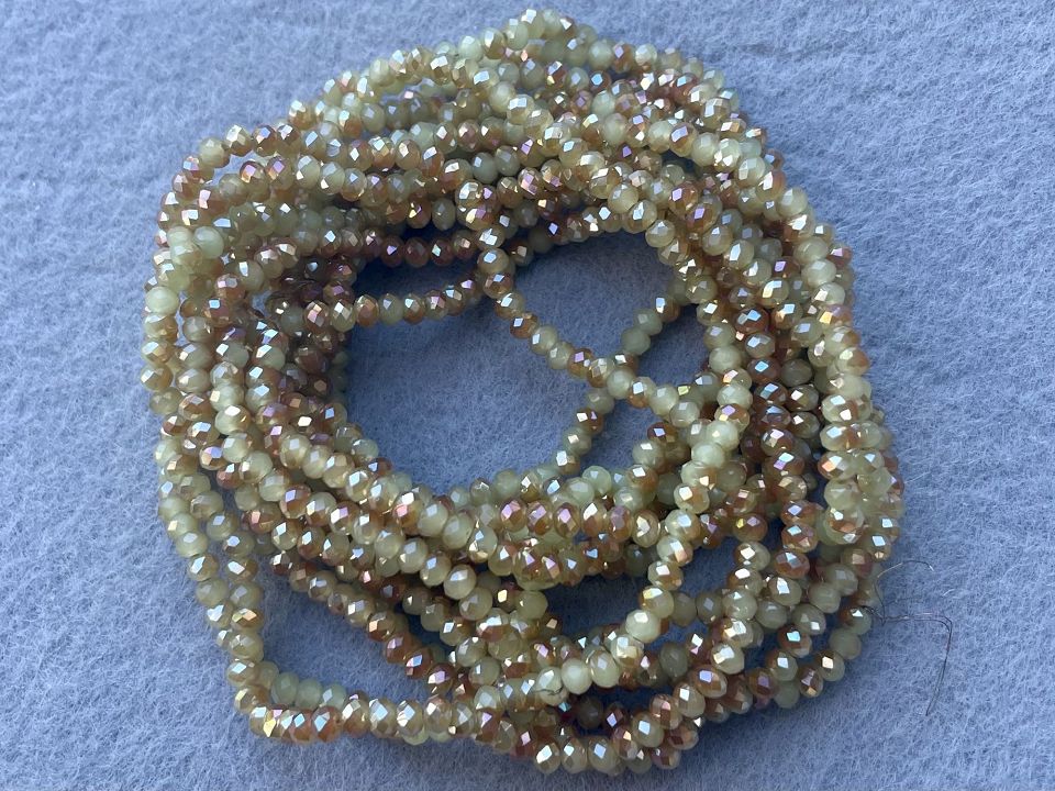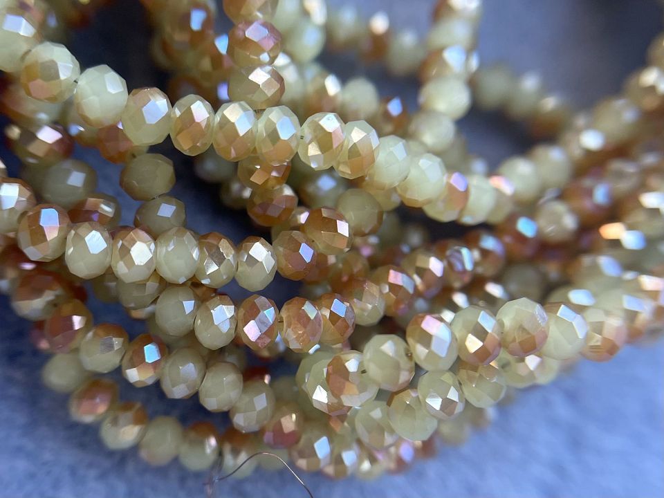 Кришталеві намистини, грановані. Розмір: 3*3,5мм, отвір: 1 мм. Форма: рондель, сфера. У нитці: 145+-5шт. Ціна за 1 нитку. Колір-салатово-бежевий.