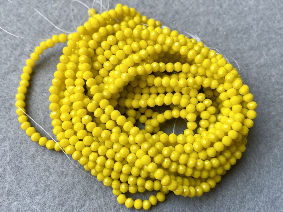 Кришталеві намистини, грановані. Розмір: 3*3,5мм, отвір: 1 мм. Форма: рондель, сфера. У нитці: 120+-5шт. Ціна за 1 нитку. Колір жовтий.