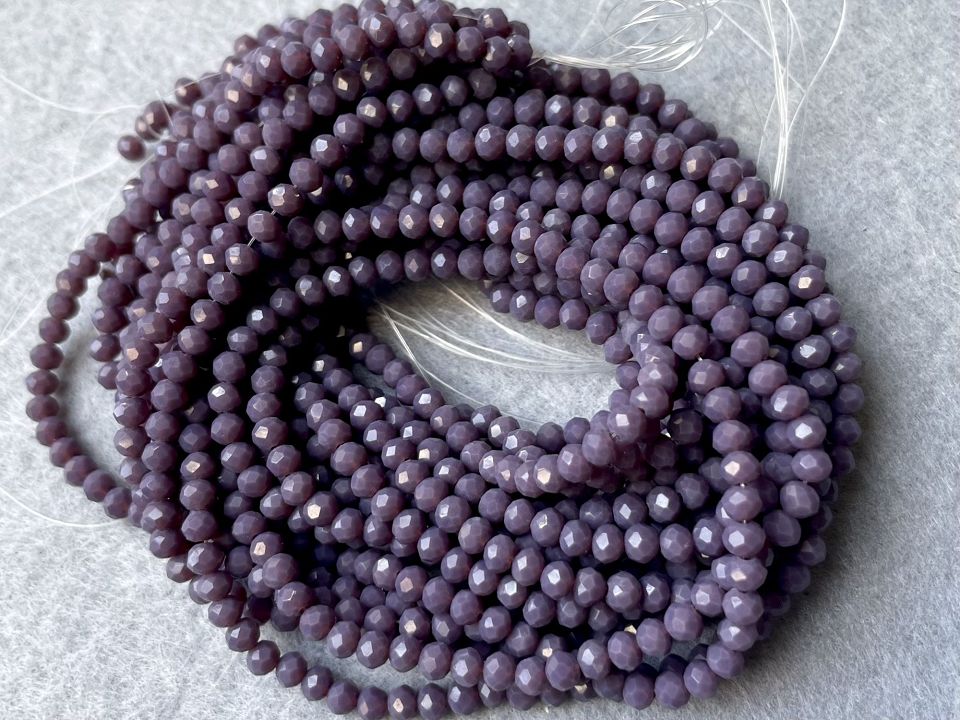Кришталеві намистини, грановані. Розмір: 3*3,5мм, отвір: 1 мм. Форма: рондель, сфера. У нитці: 120+-5шт. Ціна за 1 нитку. Колір фіолетовий.