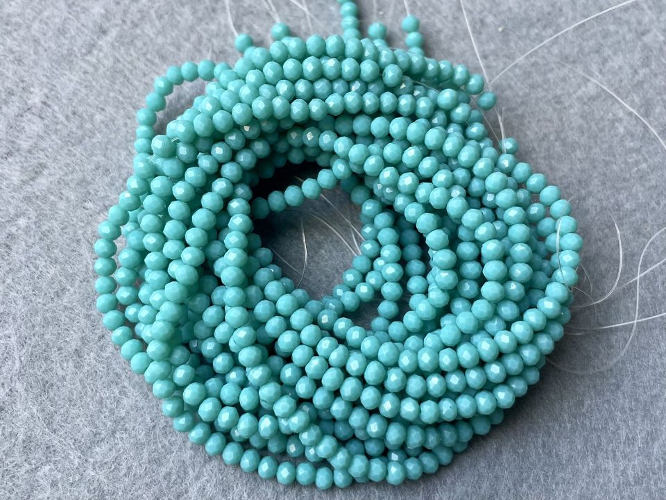 Кришталеві намистини, грановані. Розмір: 3*3,5мм, отвір: 1 мм. Форма: рондель, сфера. У нитці: 120+-5шт. Ціна за 1 нитку. Колір блакитний.