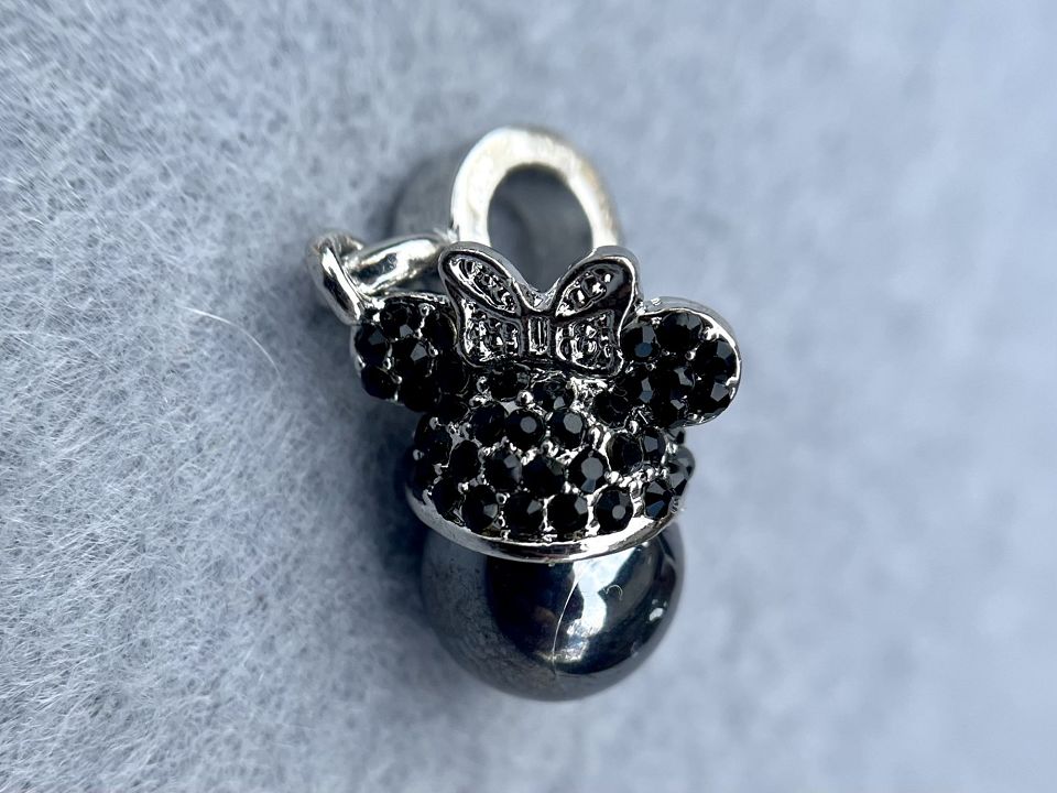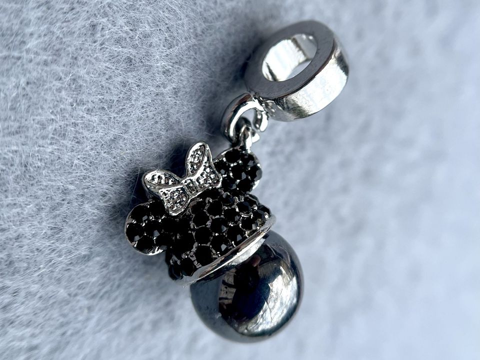 Підвіска "Мінні" зі стразами та вклеєною перлиною. Іде на намистину-бейле. Розмір бейлу: 8*3мм, розмір підвіски: 14*14мм. Колір-сталь. Ціна за 1 штуку.