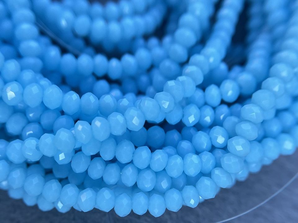 Кришталеві намистини, грановані. Розмір: 2*3мм, отвір: 1 мм. Форма: рондель, сфера. У нитці: 160+-3шт. Ціна за 1 нитку. Колір блакитний.