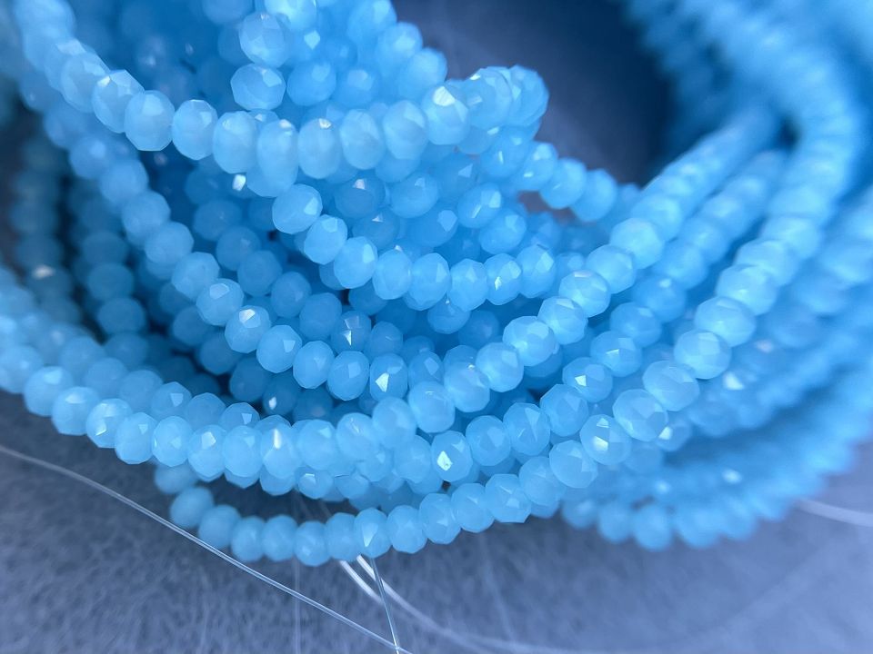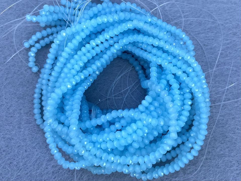 Кришталеві намистини, грановані. Розмір: 2*3мм, отвір: 1 мм. Форма: рондель, сфера. У нитці: 160+-3шт. Ціна за 1 нитку. Колір-світло блакитний-напівпрозорий.
