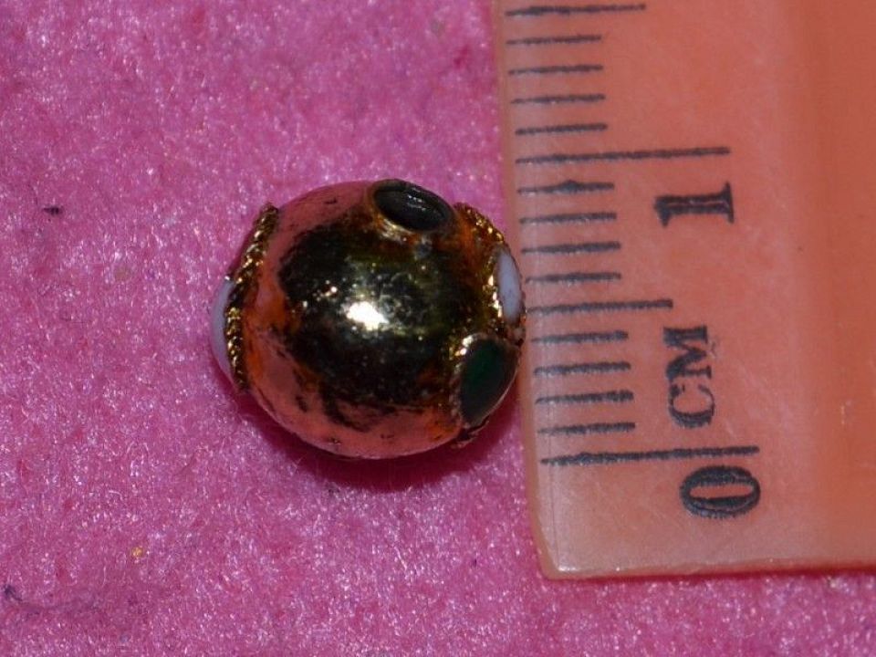 Бусина металлическая изготовлена в технике Клуазоне с элементами эмали. Диаметр 10 мм, отверстие около 2 мм. Цена за 1 шт