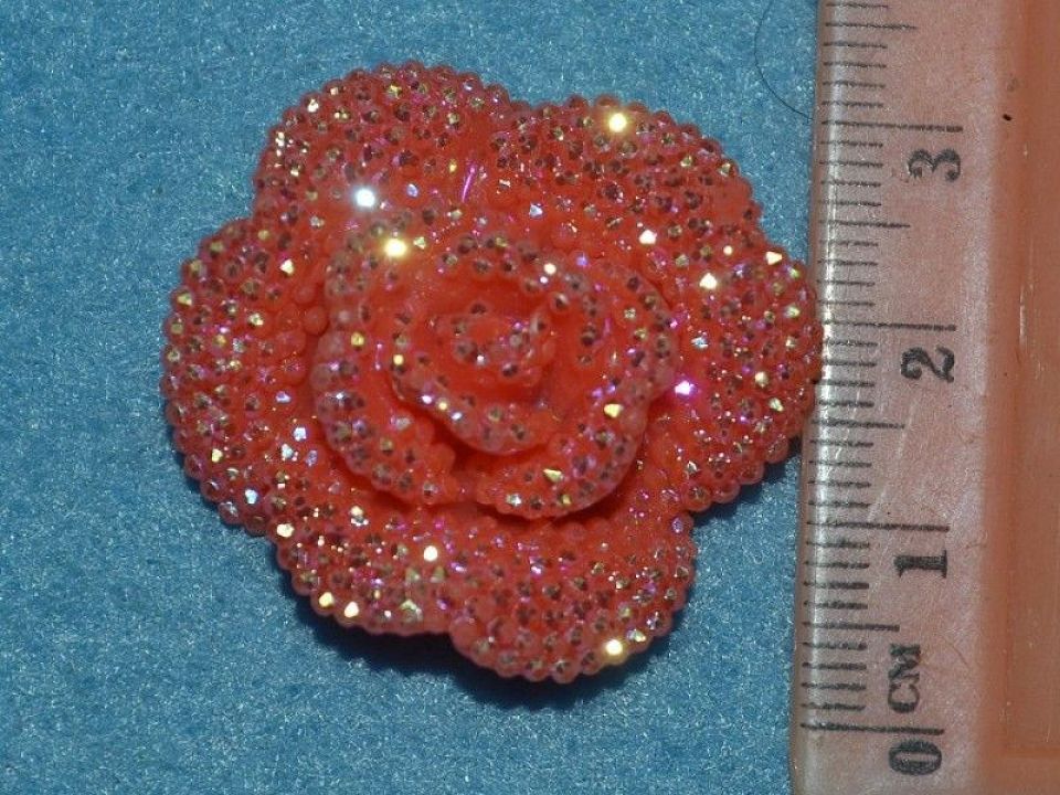 Пластиковый кабошон виде розы, усыпан камнями имеет плоское (ровное) основание. Размер розы 3см, основание 2см. Используется для украшений бантов, заколок и других различных поделок