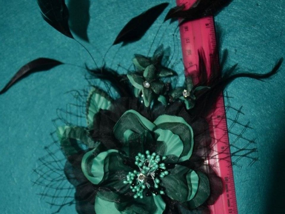Цветок декоративный 12-14см, с основанием 2 в 1-используется как брошка и заколка. Украшенная тычинками,мелкими цветочками и перьями. Цена за 1 шт
