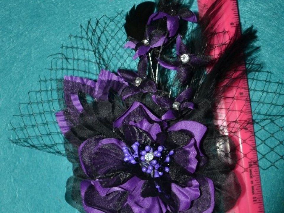 Цветок декоративный 12-14см, с основанием 2 в 1-используется как брошка и заколка. Украшенная тычинками,мелкими цветочками и перьями. Цена за 1 шт