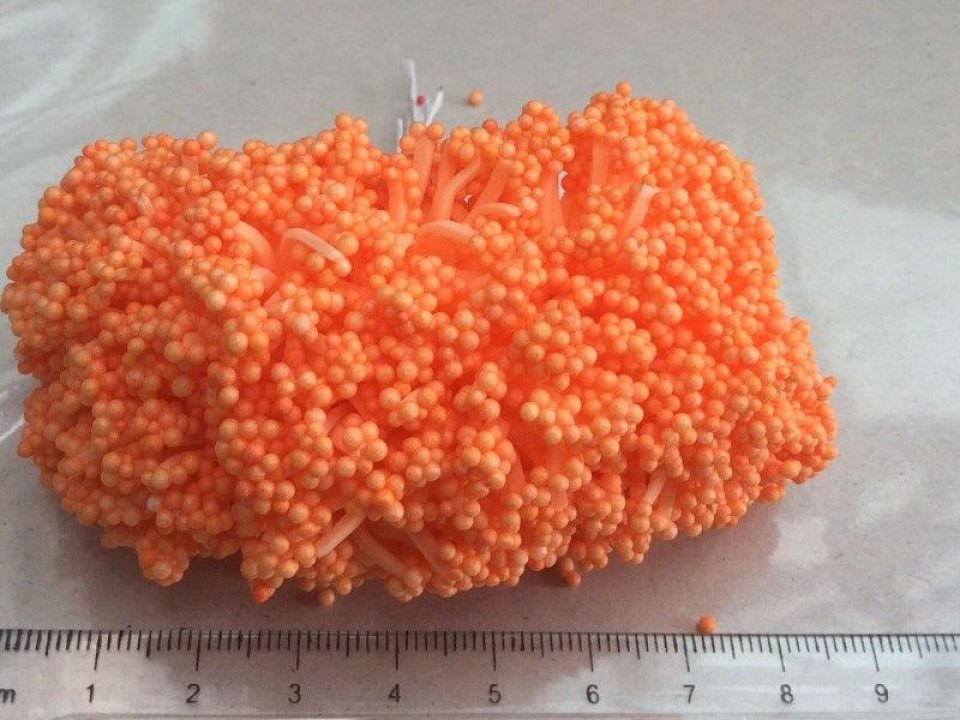Тычинка-травка представляет собой множество маленьких окрашенных шариков из пенопласта на ниточках или проволоке .Цена за упаковку -12 букетов