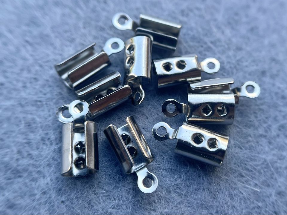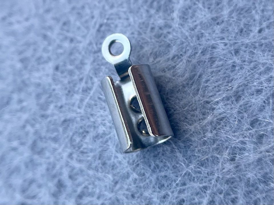 Зажим для ленты-шнура из нержавеющей стали. Длина с петлей - 10мм; Длина зажима 6мм; Ширина зажима 4мм; Цена за 10штук.