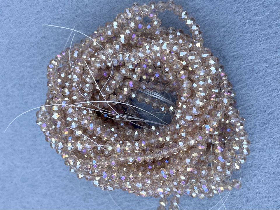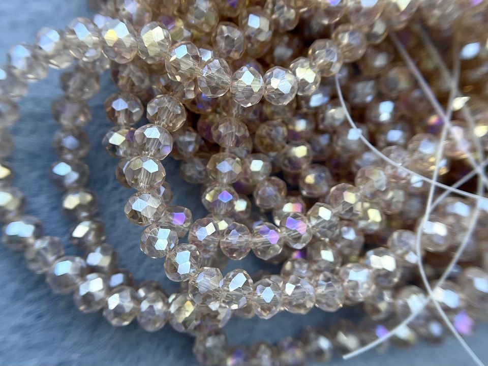 Хрустальные бусины, гранёные. Размер :4*4,5мм, отверстие : 1мм. Форма: рондель,сфера . В нитке: 143+-5шт. Цена за 1 нитку. Цвет- бежевый с переливом .
