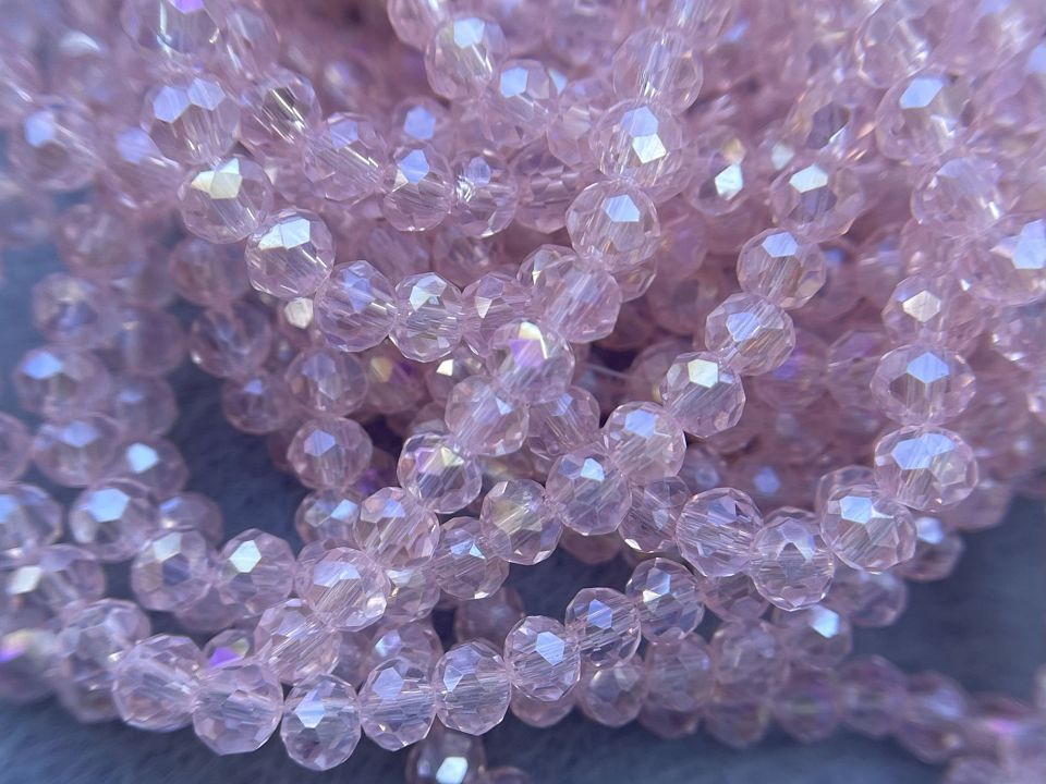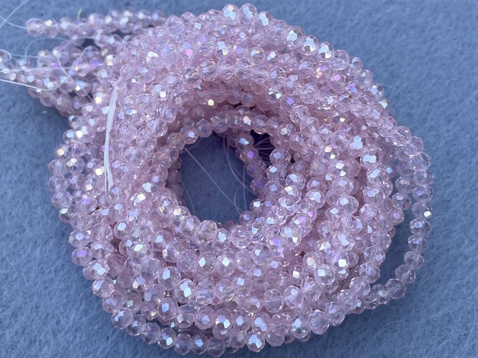 Хрустальные бусины, гранёные. Размер :4*4,5мм, отверстие : 1мм. Форма: рондель,сфера . В нитке: 143+-5шт. Цена за 1 нитку. Цвет- розовый с переливом .