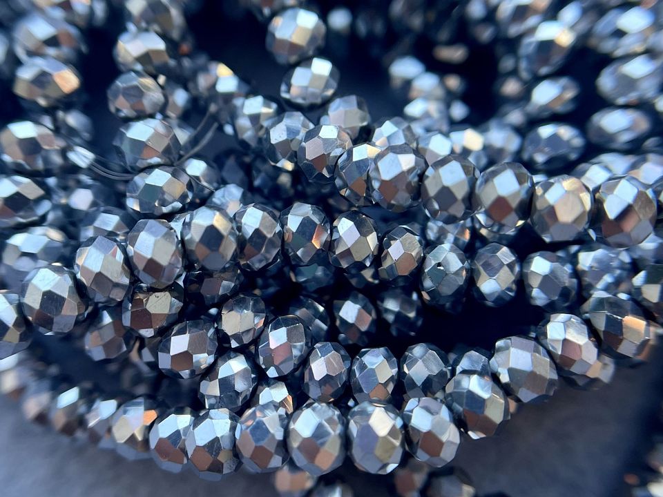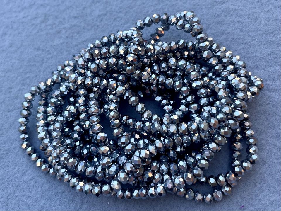 Хрустальные бусины, гранёные. Размер :4*4,5мм, отверстие : 1мм. Форма: рондель,сфера . В нитке: 143+-5шт. Цена за 1 нитку. Цвет- серебро.