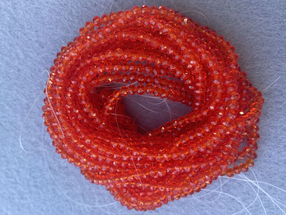 Хрустальные бусины, гранёные. Размер :3*3,5мм, отверстие : 1 мм. Форма: рондель,сфера . В нитке: 145+-5шт. Цена за 1 нитку. Цвет- оранжевый .