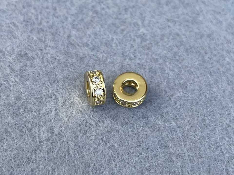Бусины-рондели инкрустированы Кубическим цирконием (также называются бусинами с фианитами). Размер : 7мм ,ширина - 3мм. Отверстие: 3мм. Покрытие родий Цвет-золото, цена за 1 шт.