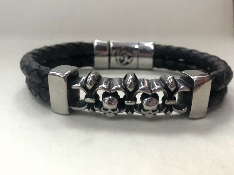 Плетеный кожаный браслет со стальной застежкой и декоративными фрагментами. Размер в наличии:22см