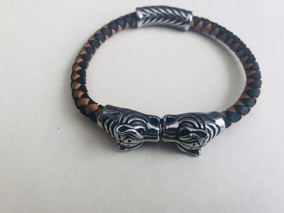 Плетеный кожаный браслет со стальной застежкой и декоративными фрагментами. Размер в наличии:21