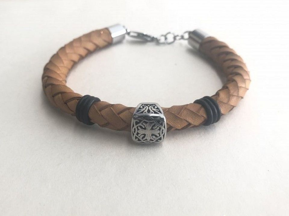 Плетеный кожаный браслет со стальной застежкой и декоративными фрагментами. Размер в наличии:20см
