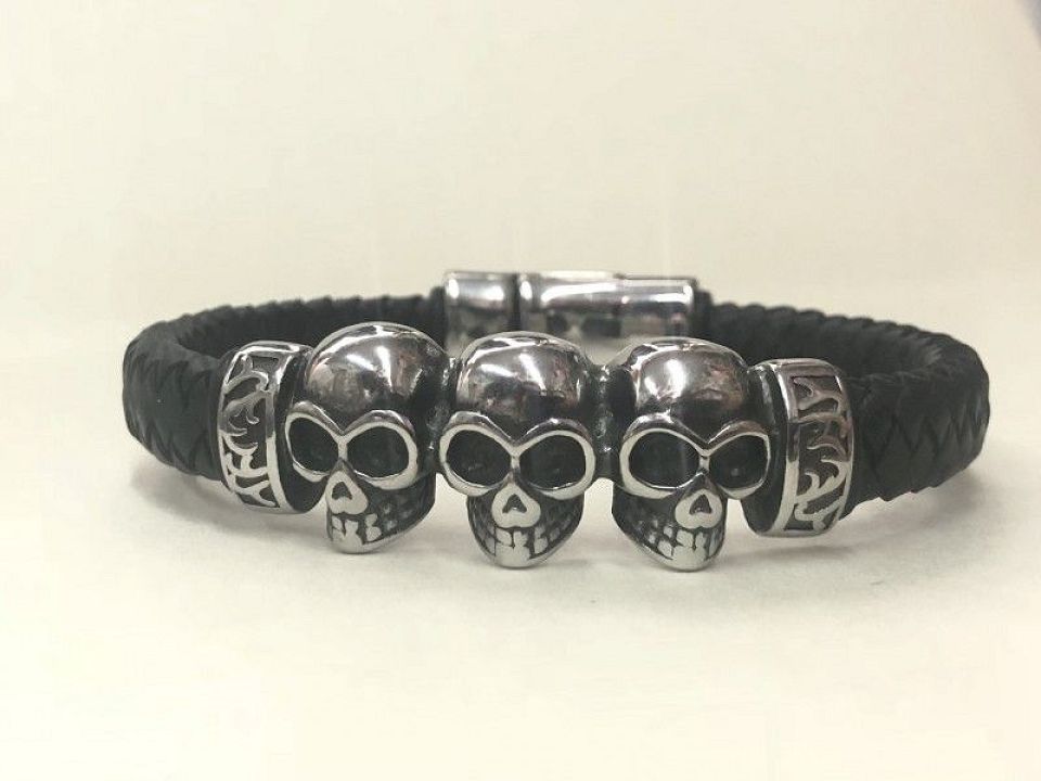 Плетеный кожаный браслет со стальной застежкой и декоративными фрагментами. Размер в наличии:22см