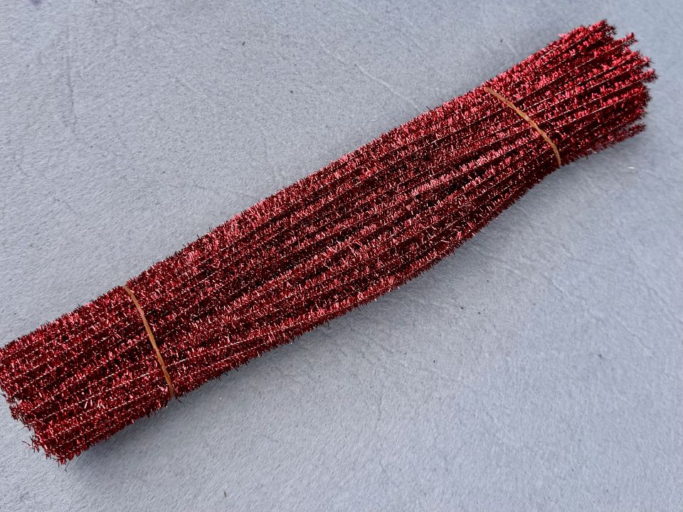 Синельная проволока (мохнатая проволока, пушистая проволока,скрутик). Пушистая и бархатная, отличный материал для различных видов прикладного творчества! Мохнатая проволока отлично гнется, держит форму, ей легко вернуть изначальную прямую форму при необходимости. Без проблем режется обычными ножницами, не скользит. Из синельной проволоки ребенок с удовольствием смастерит фигурки забавных зверят, буквы и цифры! Прекрасно заменяет обычную проволоку, можно вставить в качестве каркаса внутрь самодельной игрушки - получаются замечательные гнущиеся ручки и ножки. Бархатный прутик-скрутик для подарков подойдет для оригинального оформления подарочной упаковки. упк-от 90-100шт 30см.Цвет-красный металлизированный