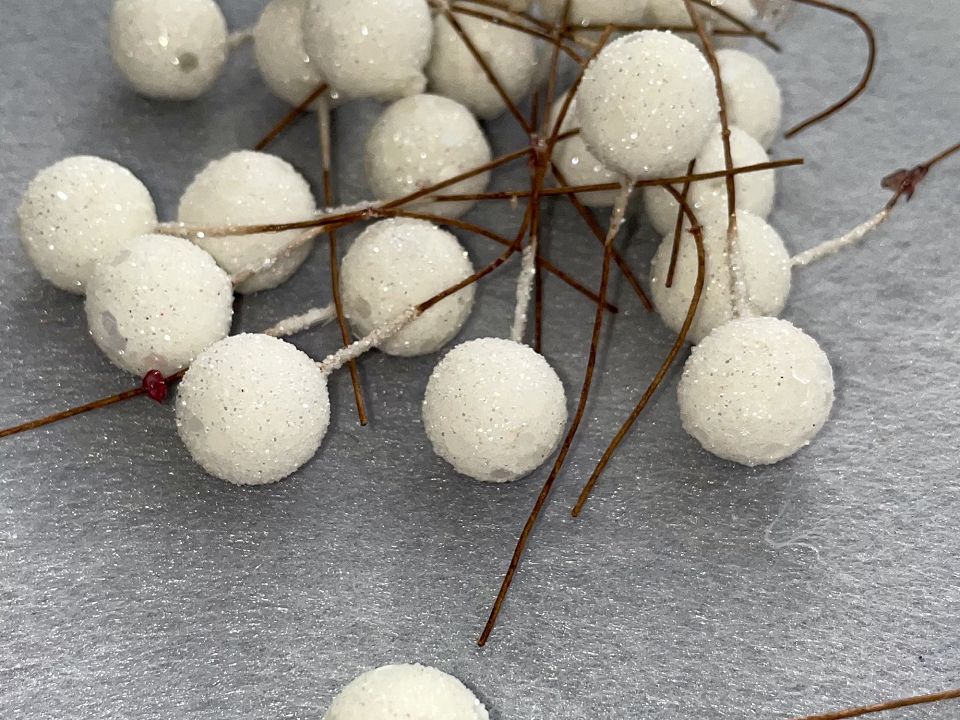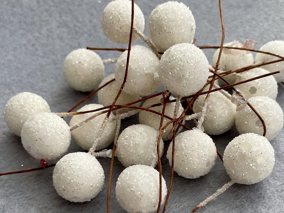 Ягодки сделаны из пенопластового шарика покрытого слоем мягкого винила и усыпаны глиттером.