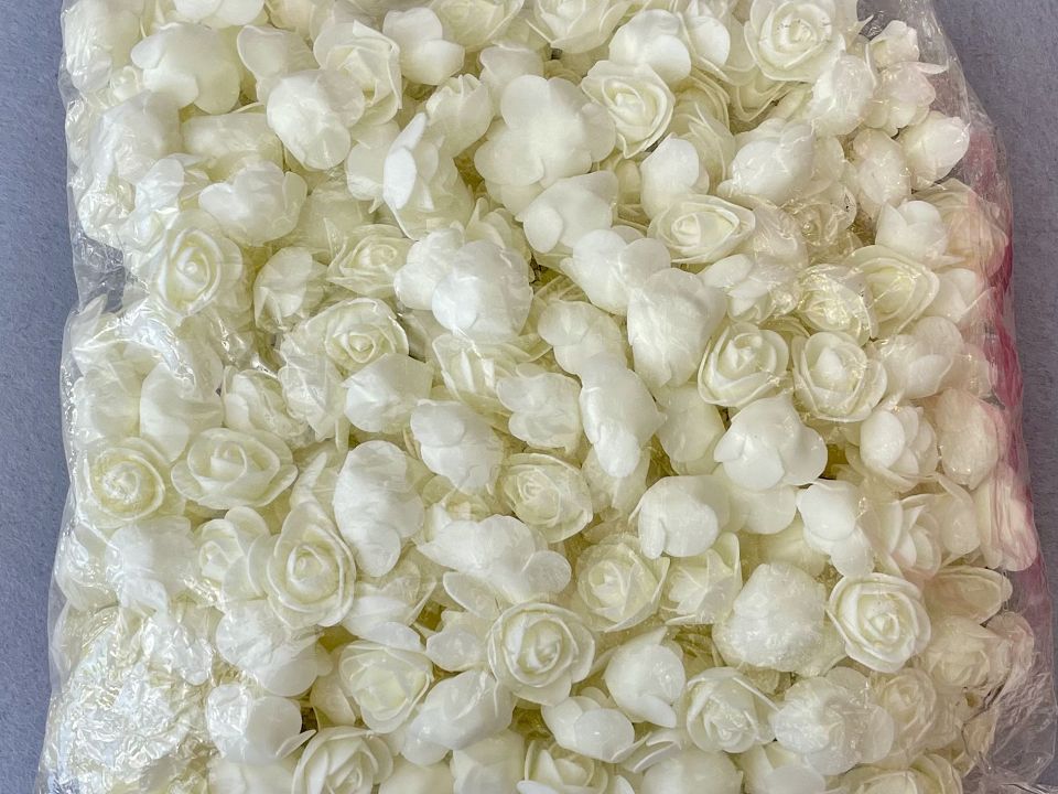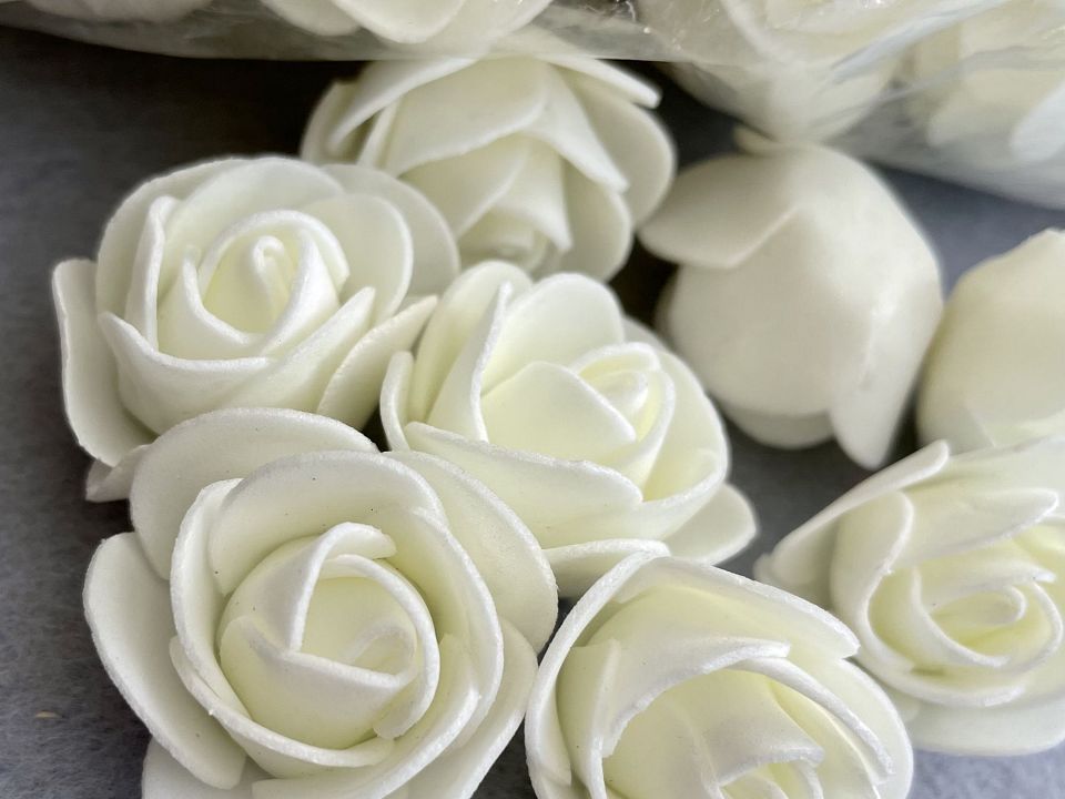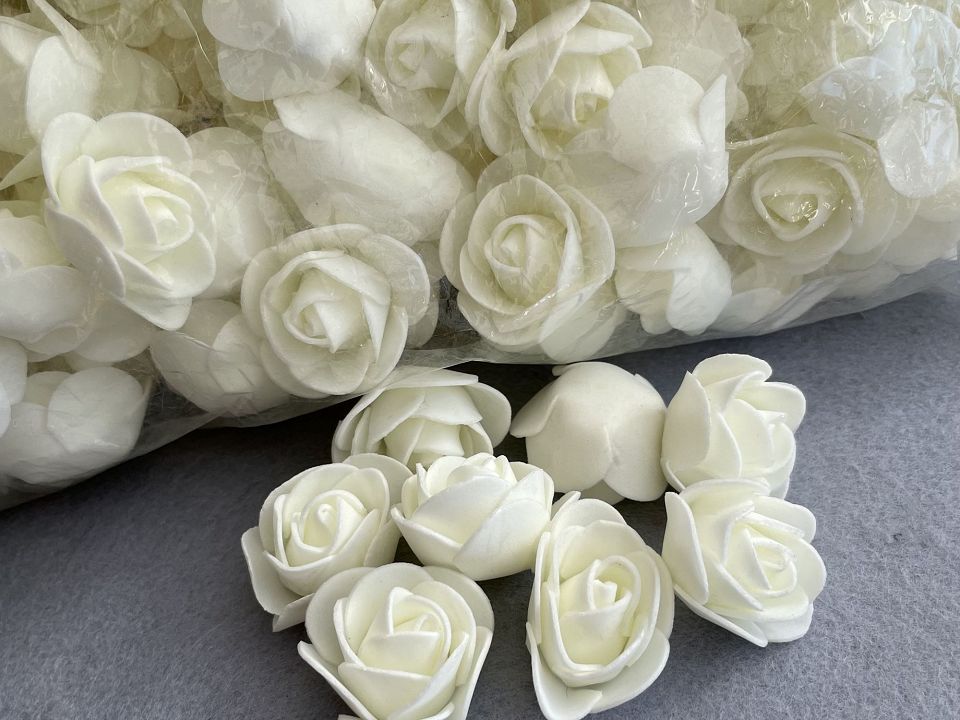 Розы из фоамирана Ø3,5-4см. Упаковка: 500 шт. Цветы из фоамирана легко расправляются с помощью пара или фена. Размер упаковки:30*30см. Цвет-молочный