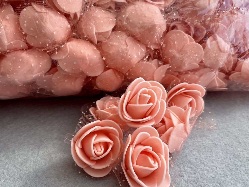 Розы из фоамирана с фатином Ø3,5-4см. Украшены Упаковка: 500 шт. Цветы из фоамирана легко расправляются с помощью пара или фена. Размер упаковки:30*30см. Цвет- персиковый