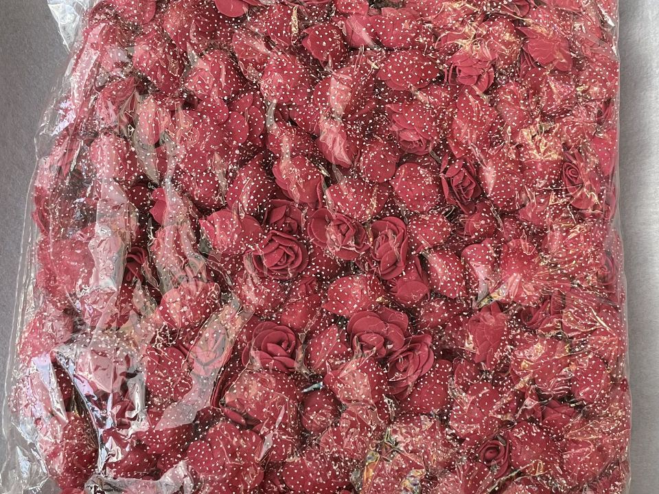 Розы из фоамирана с фатином Ø3,5-4см. Украшены Упаковка: 500 шт. Цветы из фоамирана легко расправляются с помощью пара или фена. Размер упаковки:30*30см. Цвет- бордовый