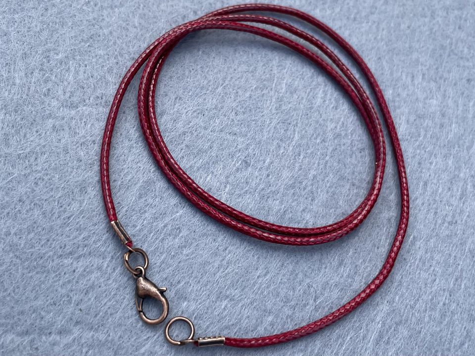 Шнурок на шею для кулонов и подвесок. Сделан с пропитаного вощенного шнура. Диаметр: 2-2,5мм. Размер шнурка: 52-57см. Цвет-бордовый. Цена за 100 штук.
