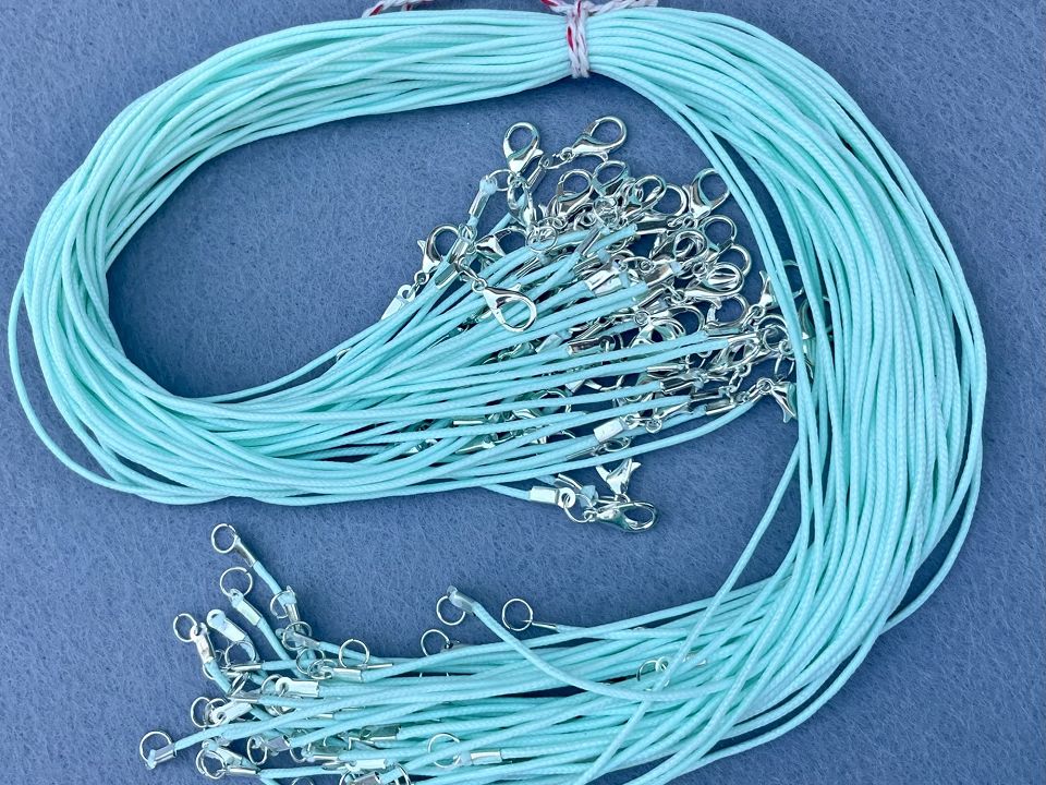 Шнурок на шею для кулонов и подвесок. Сделан с пропитаного вощенного шнура. Диаметр: 2-2,5мм. Размер шнурка: 52-55см. Цвет-мятный. Цена за 50 штук.