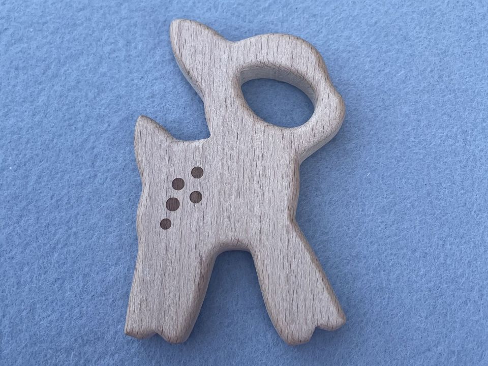 Грызунок деревянный "Бемби". Деревянный, фигурный грызунок для слингобус. Аксессуар изготовлен из натуральной древесины (бук), качественно обработан, не покрыт лаком. Такой грызунок полностью безопасен для малыша, он не оставит занозу. Размер: 6,5*10,5см.