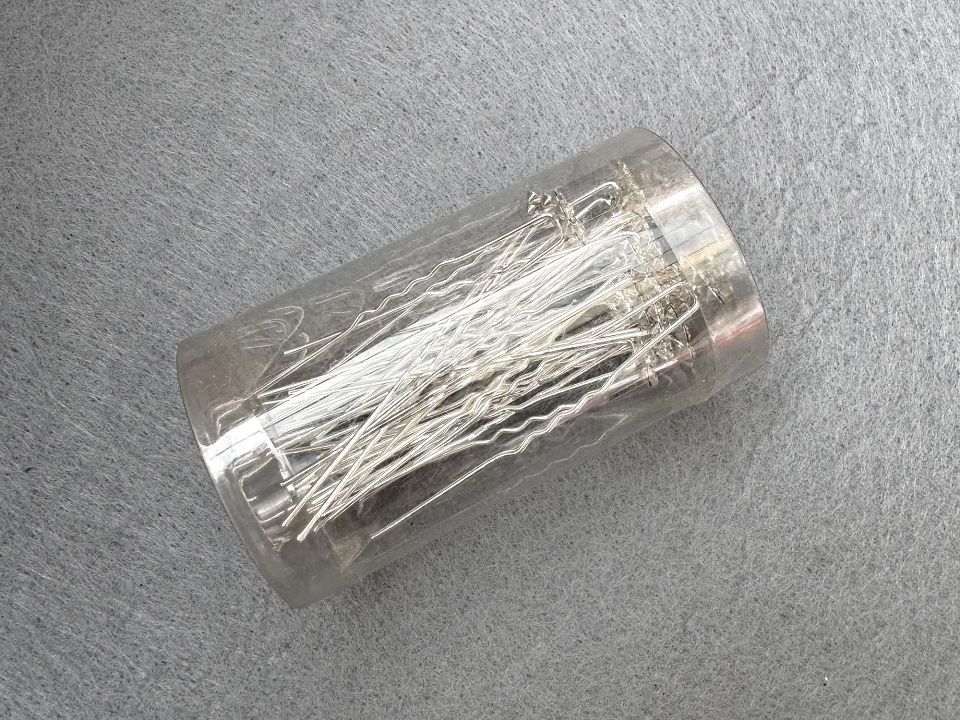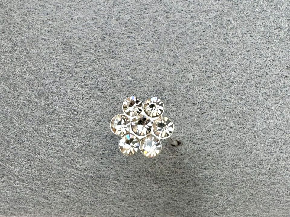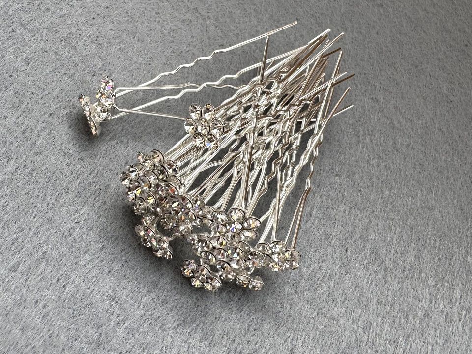Шпильки для волос серебристого цвета, украшенные хрустальными стразами в виде цветка. Длина булавки 7 см, диаметр цветка 1,2 см. Цена указана за 1 упаковку - 20шт.