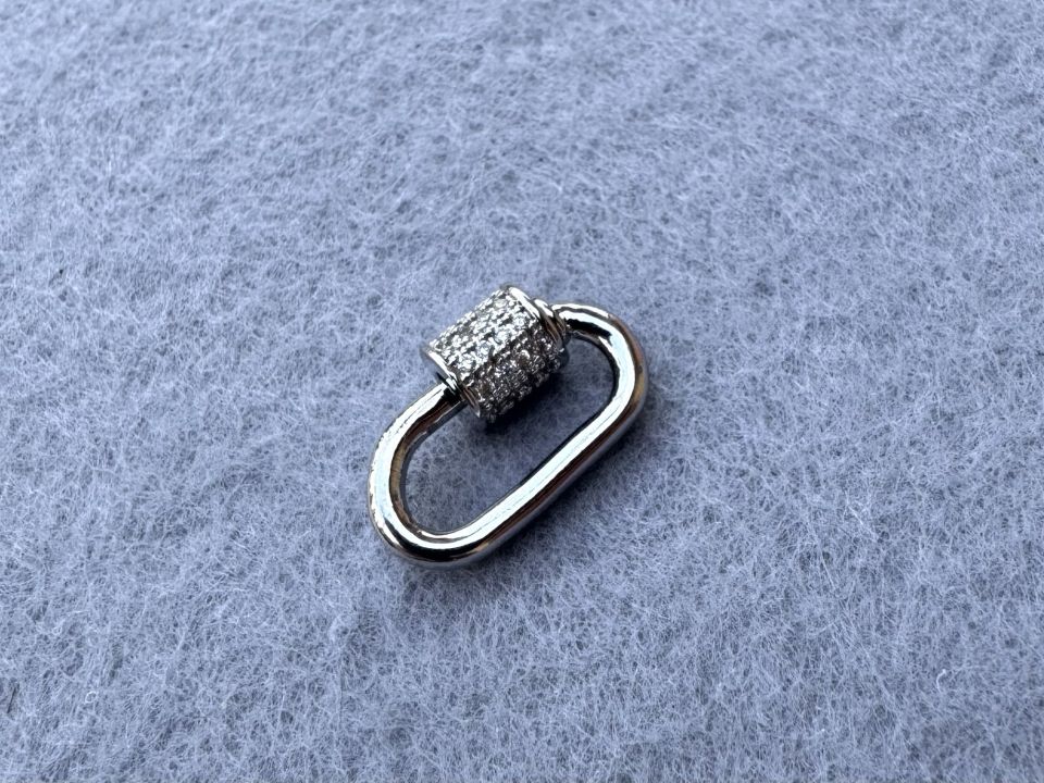 Родированный замочек для бижутерии " Овал", с инкрустацией фианитами. Размер: 10 * 16 мм. Цвет-сталь. Качественная фурнитура класса Люкс. Цена указана за одну штуку. Закручивающаяся застежка – незаменимая фурнитура для тяжелых украшений. Она надежно фиксирует массивное колье из цепей или бусы из натуральных камней. Застежка карабин идеально подойдет для создания украшений на шею. Закручивающаяся застежка из металла используется не только для бижутерии, но и при изготовлении брелоков, сумок и как декоративный элемент.