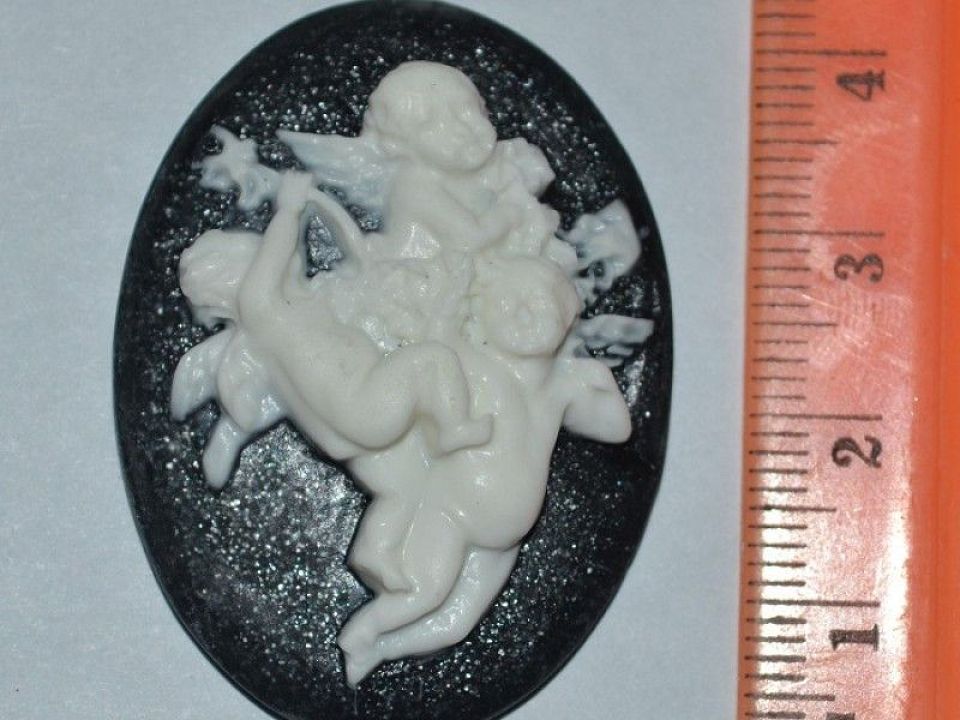 Камея-кабошон пластиковый изображением ангелочков - 45*30мм. Форма овальная с плоским основанием.